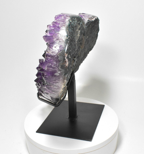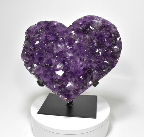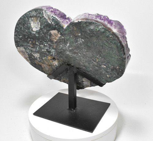 Beautiful Polished Amethyst Heart with stand. Polished on the sides of the heart. There is speckeld Purple spots and some Cacoxenite. Very nice formation with some darker tip resembling phantoms.Displays well and is a beautiful addition to any collection.
