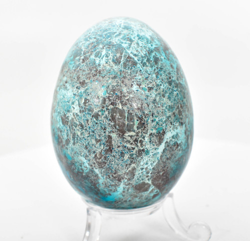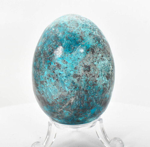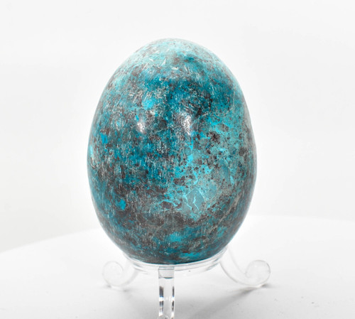 Polished Shattuckite Egg with stand. The Egg is not perfect smooth. Color is off some in pictures closer to video. Displays well and is a beautiful addition to any collection. Locality: