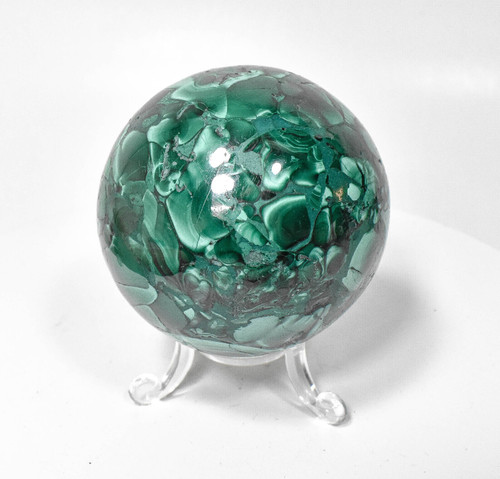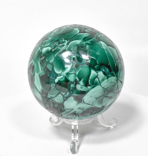 Polished Malachite Sphere with stand. Displays well and is a beautiful addition to any collection.