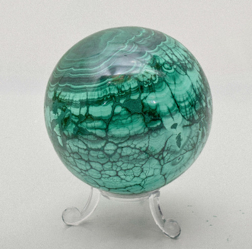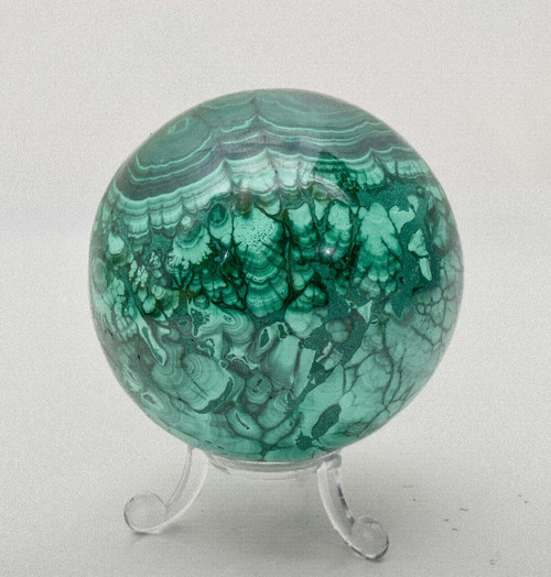 Polished Malachite Sphere with stand. Displays well and is a beautiful addition to any collection.
