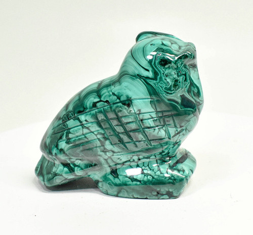 Polished Malachite Owl Carving. The Carving is hand made and polished by Congolese Artisans directly from the D.R. Congo. Unique one of a kind and much better in person. Displays well and is a beautiful addition to any collection.