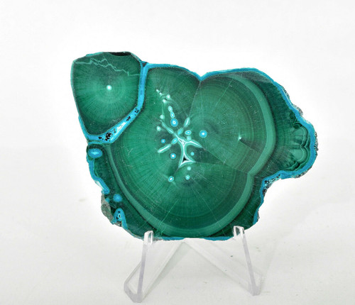 Polished Chatoyant Malachite, Chrysocolla and Cornetite slice with stand. Video is a little dark. Much better in person. Displays well and is a beautiful addition to any collection.