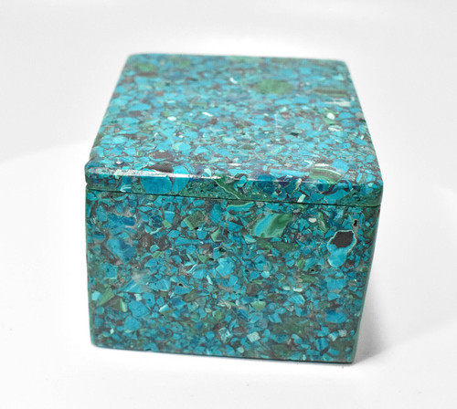 Polished Malachite, Chrysocolla, Azurite Jewelry box. This box is a composite made using chips and than Polished. May also contain Hetrogentie, Cornetite and Shattuckite. Much better in person. Displays well and is a beautiful addition to any collection.