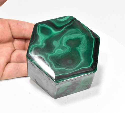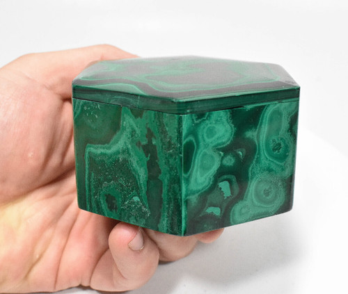 Polished Malachite Hexagon Jewelry box. Much better in person. Displays well and is a beautiful addition to any collection.