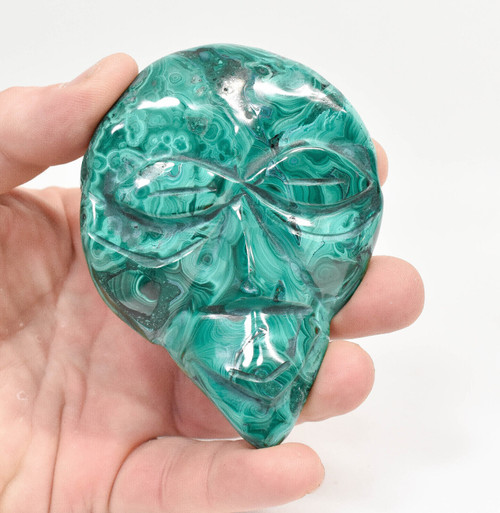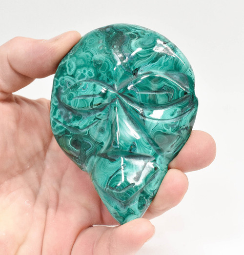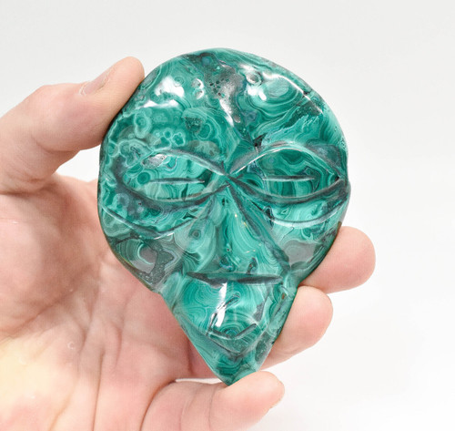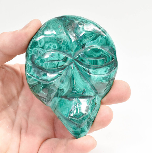 Polished Malachite Tribal Mask Carving. The Carving is hand made and polished by Congolese Artisans directly from the D.R. Congo. Unique one of a kind and much better in person. Displays well and is a beautiful addition to any collection.