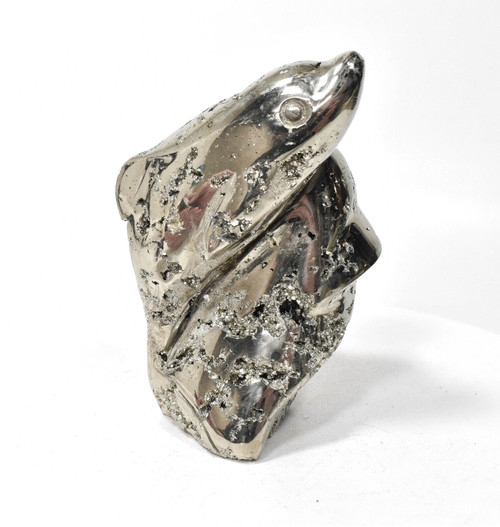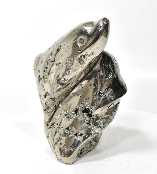 Beautiful Polished Pyrite Dolphin Carving. Very Intricate Art combined with well crystalized Pyrite Crystals. Much better in person. Displays well and is a beautiful addition to any collection.