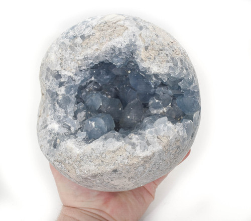 Beautiful Celestite Geode. The specimen has been shaped round like a sphere. Much better in person. Displays well and is a beautiful addition to any collection.