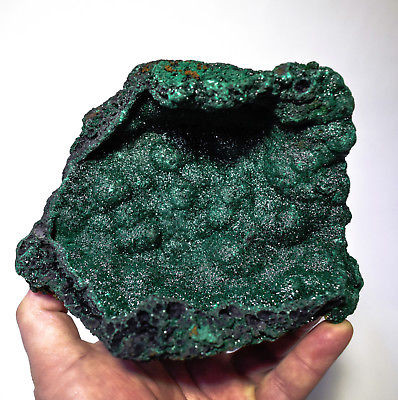 Here is an excelent vug of Druzy sparkly Malachite. Displays well and is a great addition to your collection.