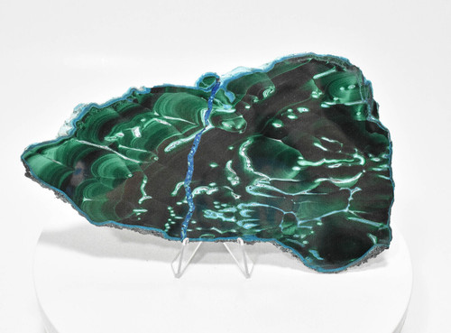 Polished Malachite, Chrysocolla and Cornetite slice with stand. The slice has been repaired in the Congo. The Malachite has a slight Chatoyantcy.
